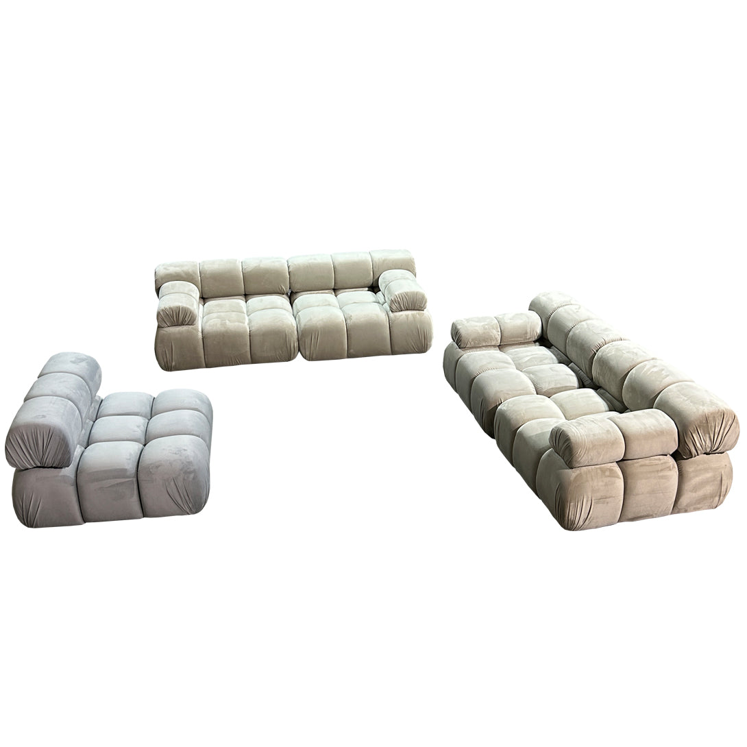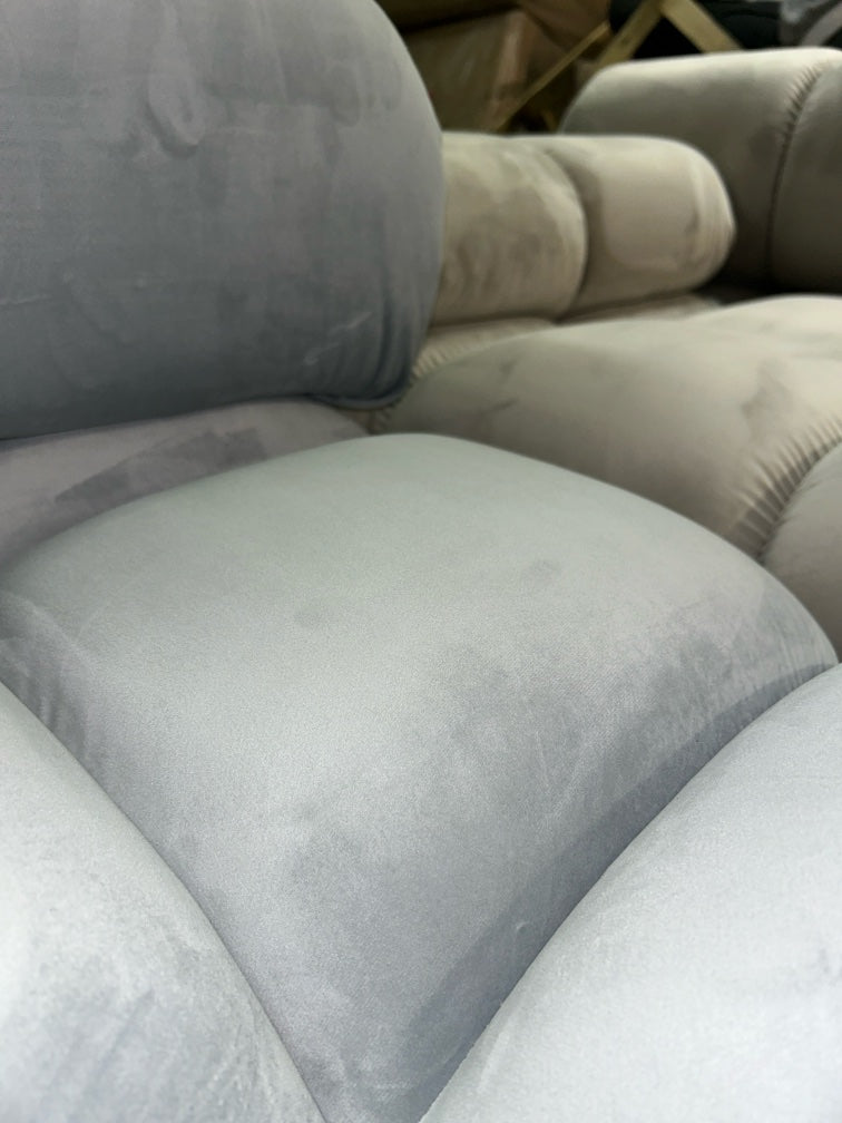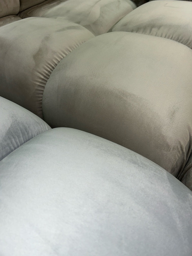 🎨 Design: Trendiges Bubble-Design – auffällig & modern 🛋️ Bezug: Eleganter Samt im Mix aus Beige & Hellgrau 🌀 Federkern: Für besten Komfort & langlebige Qualität 🔄 Modular: Frei zusammenstellbar – individuell anpassbar an dein Zuhause