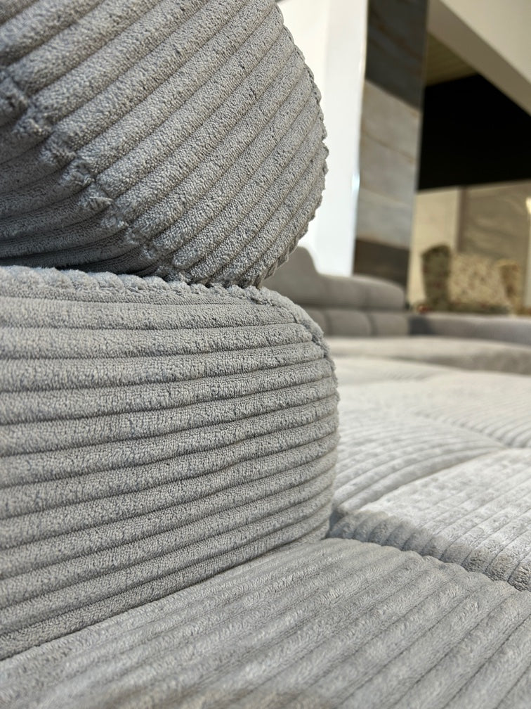 Kopfteilverstellung für individuellen Sitzkomfort 🪶 Polsterung: Hochwertiger Federkern für langlebige Bequemlichkeit 🎨 Bezug: Weicher Cord-Samt in elegantem Grau – modern & wohnlich 🏷️ Markenware – Qualität, die man spürt